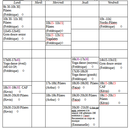 Gym-Saubens propose des cours de Pilates (principalement) mais aussi de CAF (Cuisses-Abdos-Fessiers), de Yogalates et une activité pour les enfants: le Yoga-danse.